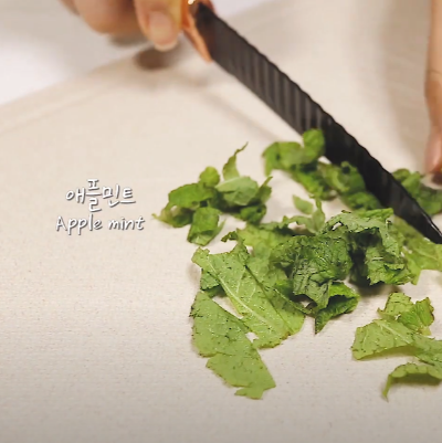 2. 애플민트를 잘게 다지고 딸기는 2~3등분 슬라이스해서 잘라주세요.